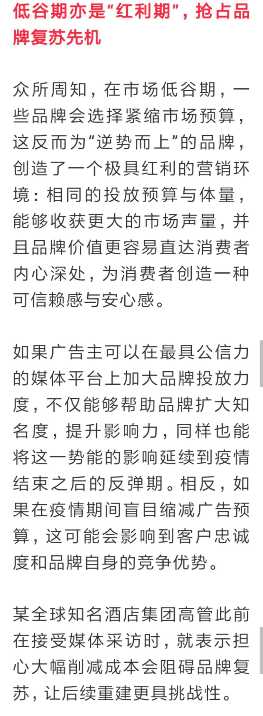 越是市场低谷期,企业越要加强品牌建设。广告尤其是硬广成了媒介价值洼地,值得加大投放力度,强化市场信心,高效抢占消费者心智。