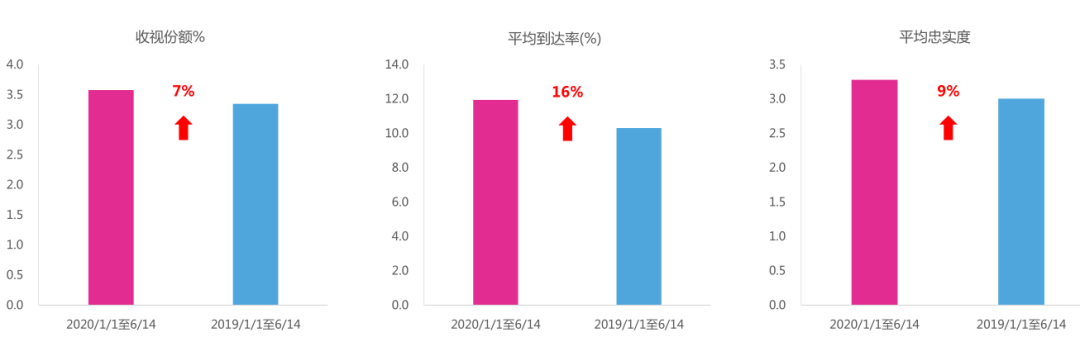CCTV-4与去年同期相比,各项指标明显上升。截止到6月14日,CCTV-4收视份额相比去年同期上涨了7%,平均到达率上涨16%,平均忠实度上涨9%。