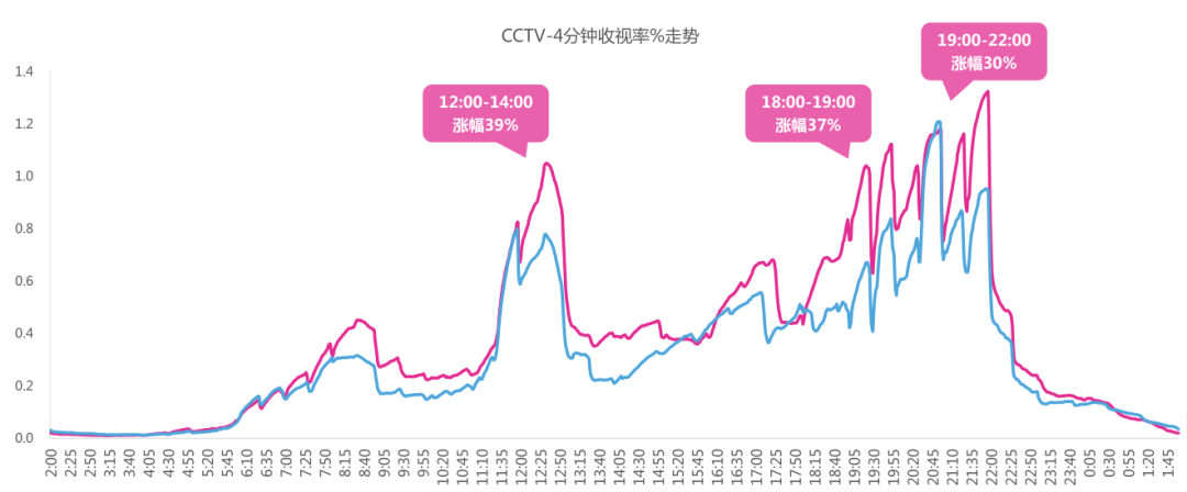 CCTV-4全天各时段收视率上涨,其中午间、傍晚和黄金时段均提升30%以上。