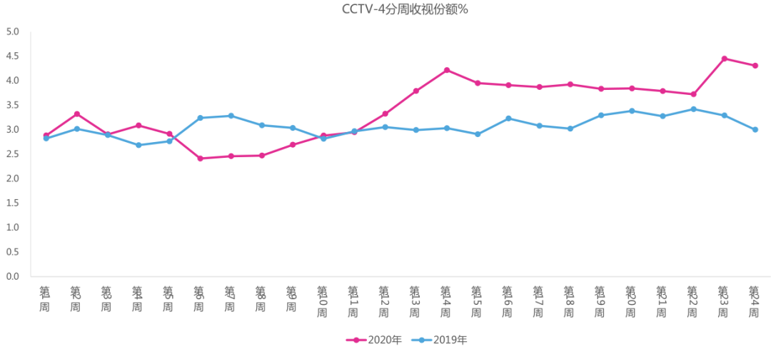 CCTV-4近四周均列上星频道冠军,自第12周起市场份额超越去年同期。