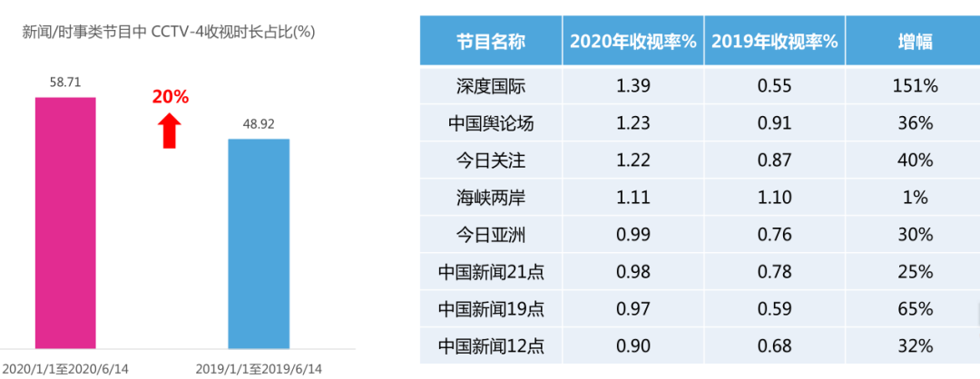 新闻类节目收视时长占比提升20%,《深度国际》《中国舆论场》《今日关注》《中国新闻》等主要节目收视增幅明显。