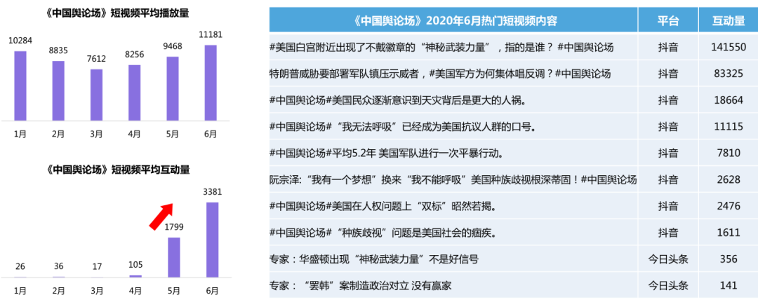 热点事件推动《中国舆论场》短视频播放量与互动量飙升。6月份短视频最高互动量达到141550次,平均播放量达到11181次。