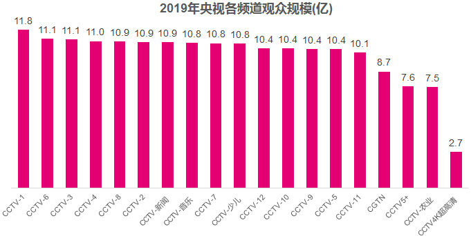 2019年,全国电视观众规模达12.81亿,是用户规模最大的媒体平台,观众日均收视时长为237分钟。其中,央视2019年观众规模达12.57亿,覆盖98.13%的电视观众。其中CCTV-1综合频道观众规模超过11.8亿,CCTV-2、CCTV-3、CCTV-4、CCTV-6、CCTV-8、CCTV-新闻、CCTV-少儿频道的观众规模均在11亿左右。
