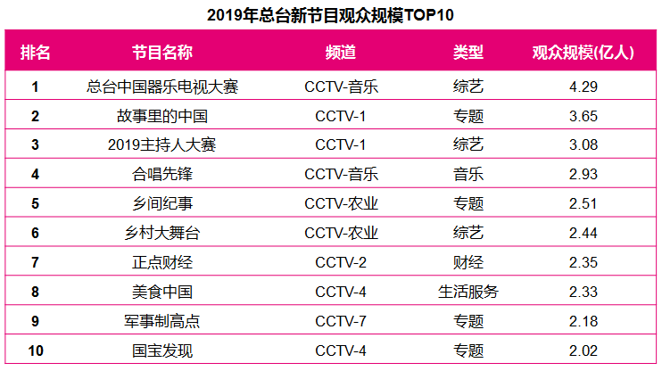 2019年,中央广播电视总台共推出《故事里的中国》《中国器乐电视大赛》《正点财经》《军事制高点》等新节目55档,其中专题类新节目高达36档。新节目在电视端触达的总观众规模为9.6亿人。