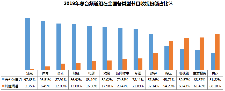 2019年,中央广播电视总台在法制、体育、音乐、财经、电影、戏剧、新闻和专题节目市场占据绝对优势,市场占有率均在八成左右。其中,在新闻、综艺和电视剧三大电视市场重点领域,总台占有率分别为80%、46%和40%。