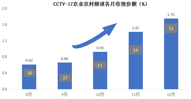 CCTV-17农业农村频道自2019年8月1日开播以来,收视份额持续走高,12月收视份额达1.75%,在上星频道内的排名也一路走高,12月上星频道排名上升至第11位。